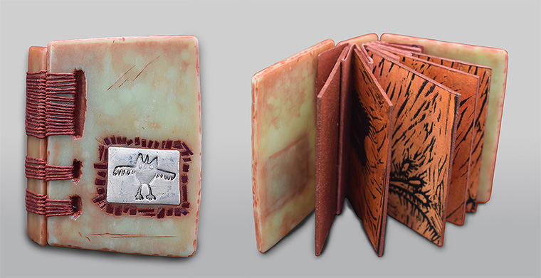 then imprinted in Precious Metal Clay. Five pages of linocuts are tipped onto Fabriano paper then bound utilizing a concertina and