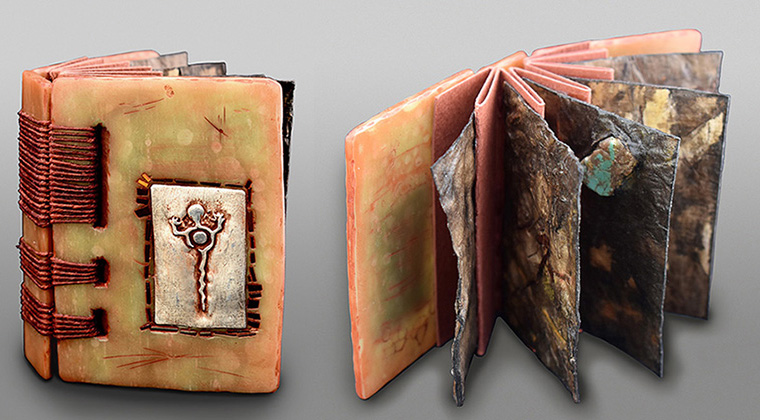 Covers of polymer and acrylic with fine silver inlay and mosaic. Inlay created from linocut reduction to photopolymer printing plate then imprinted in Precious Metal Clay. Walnut stained artist-made paper with inclusions of linocut, bark, turquoise and mother of pearl.