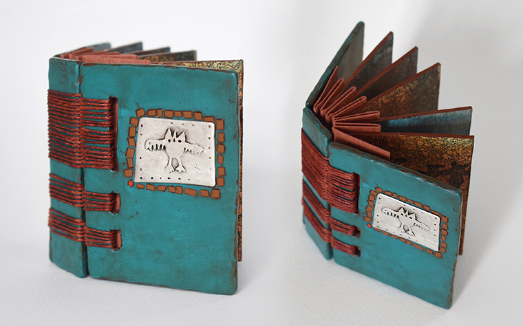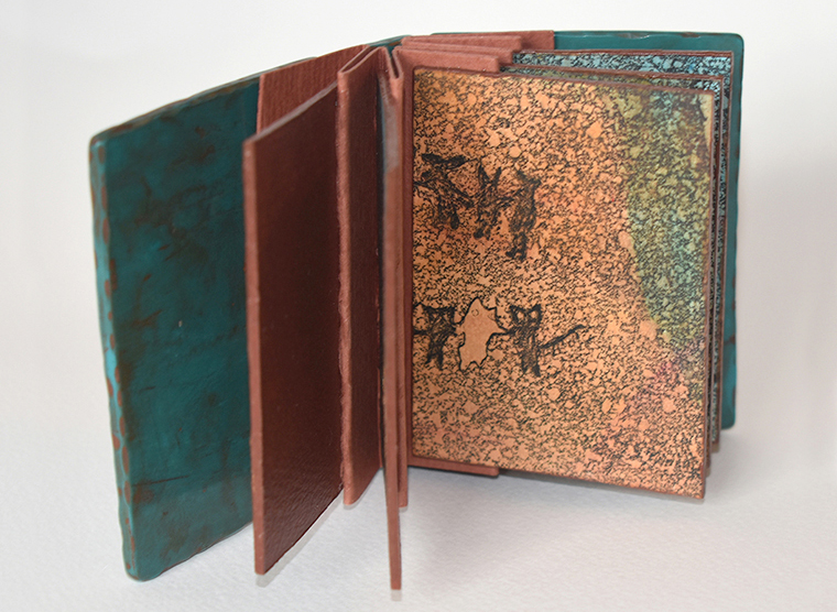 then imprinted in Precious Metal Clay. Five pages of etchings are tipped onto Fabriano paper then bound utilizing a concertina and